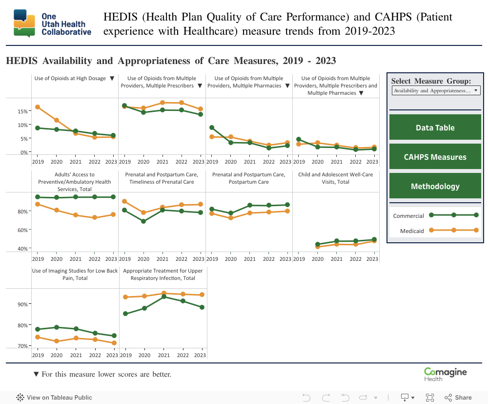 This dashboard provides a visual representation of Utah HEDIS (Healthcare Effectiveness Data and Information Set) and CAHPS (Consumer Assessment of Healthcare Providers and Systems) data, allowing for easy comparison of health plan performance and trends and a comprehensive overview of performance metrics related to patient access, provider communication, care coordination, and overall satisfaction with health plans in Utah from 2019 through 2023. Key features of the HEDIS CAHPS dashboard include: